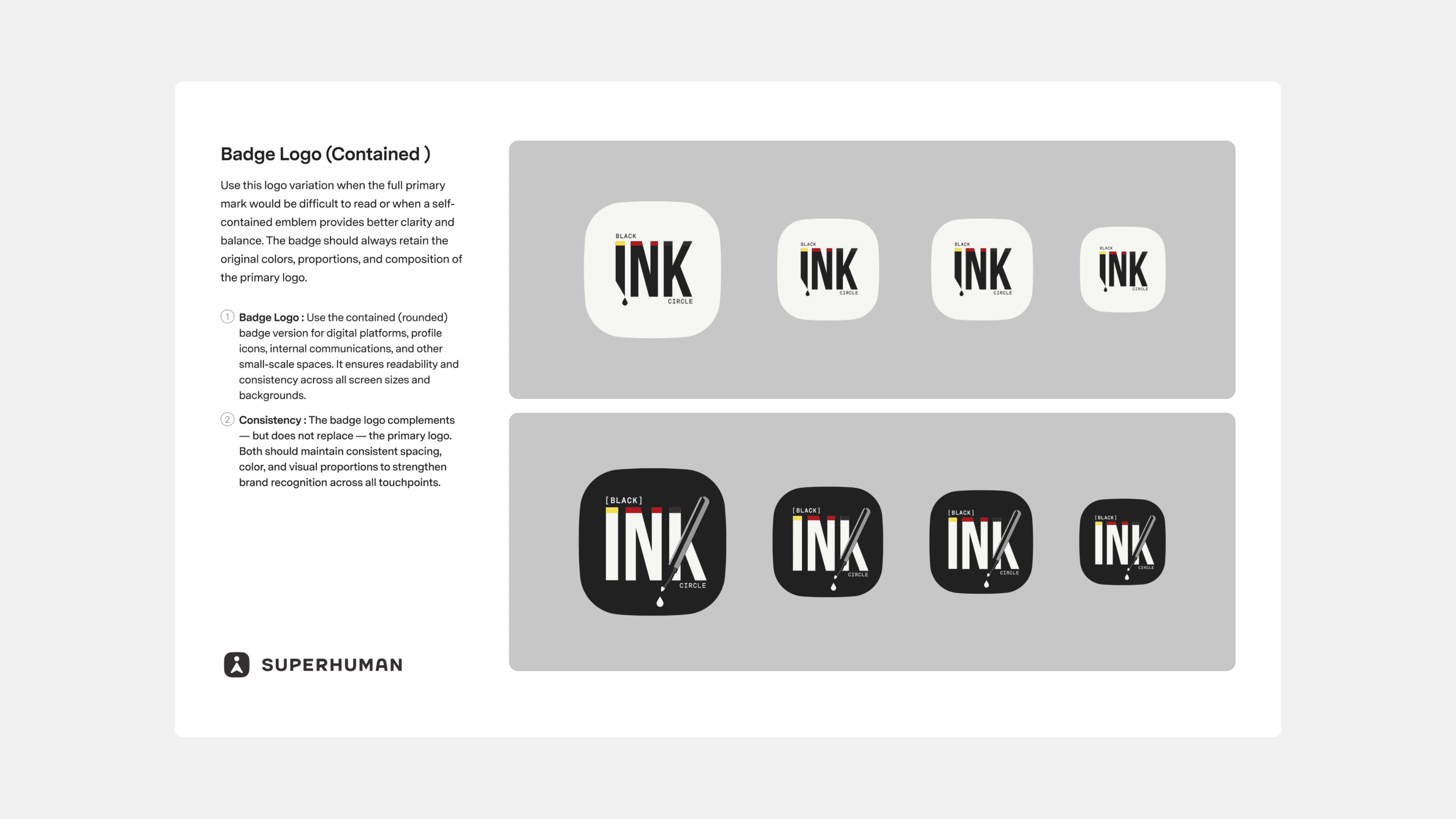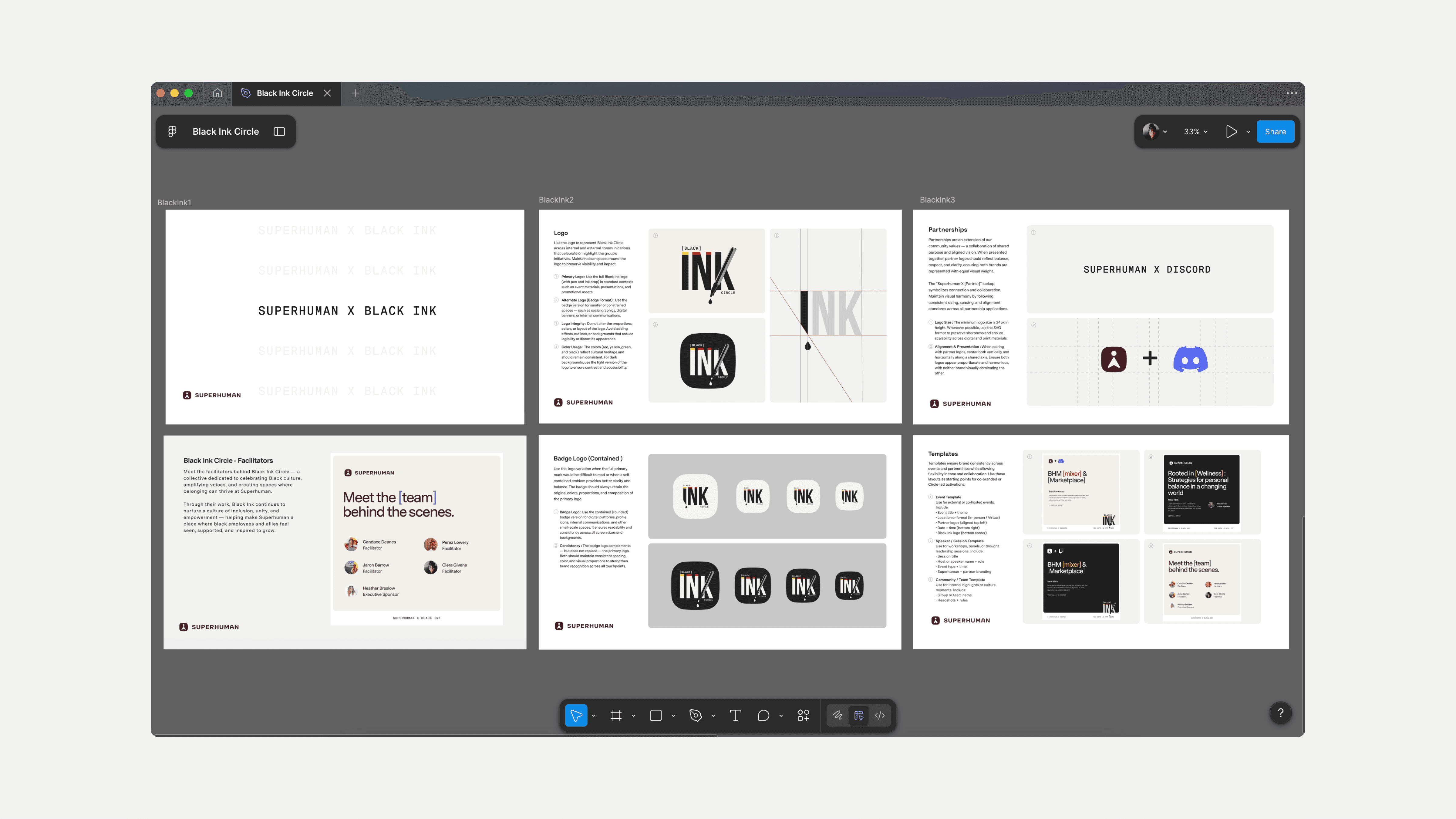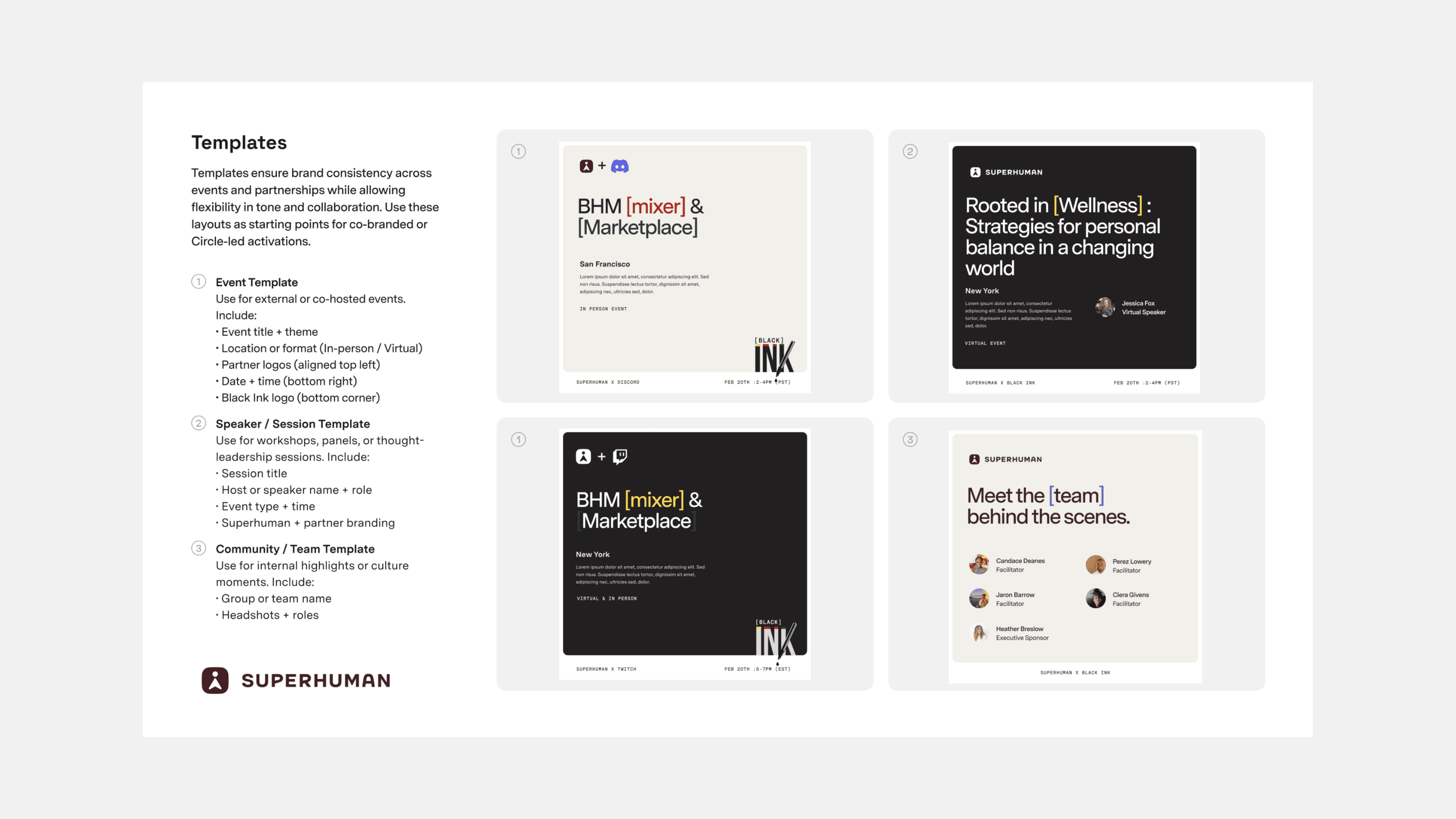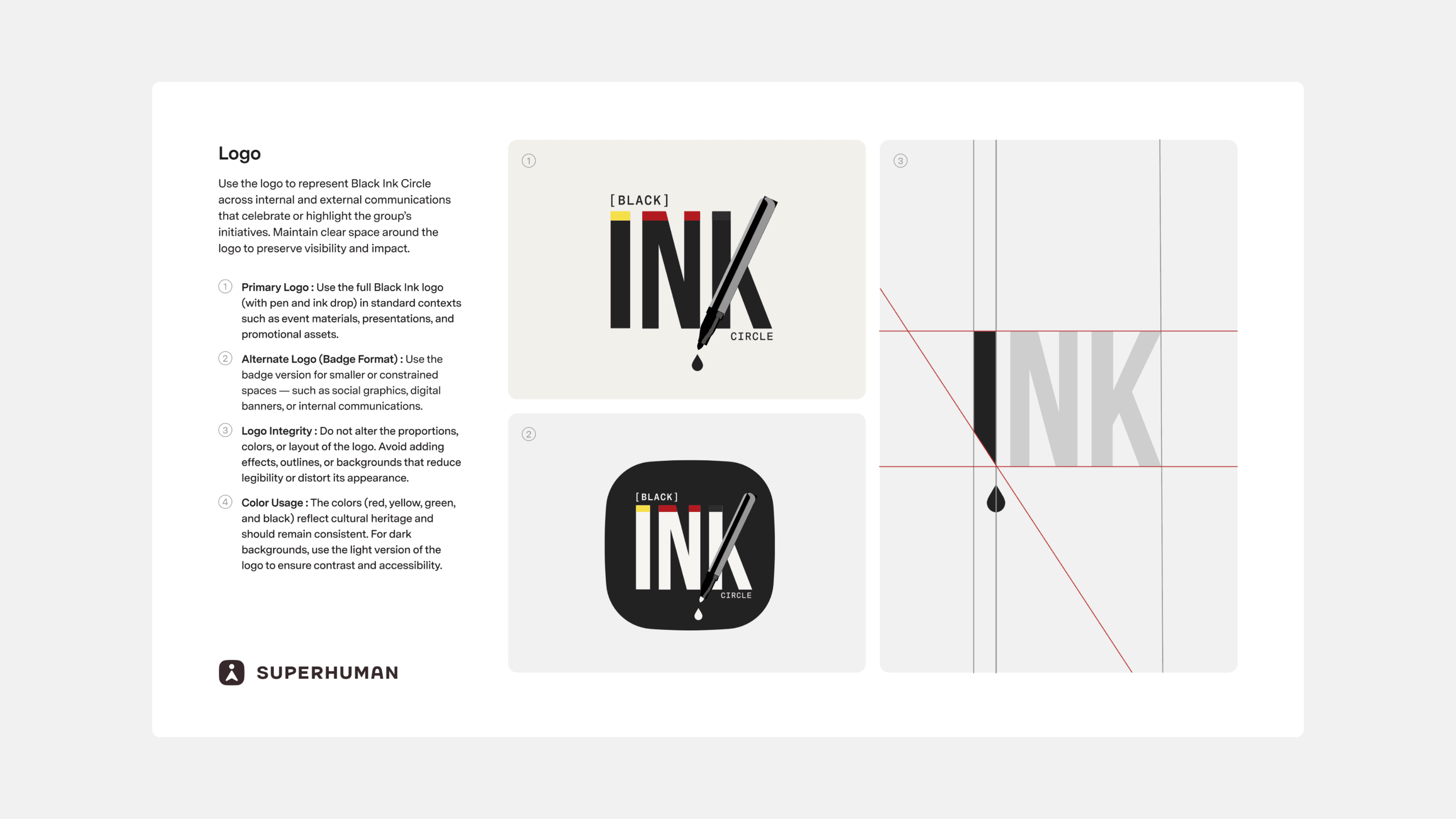 At Grammarly, I created the Black Ink Circle ERG brand and guidelines to bring clarity, consistency, and craft to how the group shows up across internal communications, event marketing, and cross-ERG moments. Black Ink Circle is an Employee Resource Group for black employees and allies focused on building community, belonging, and space for honest dialogue. The system established a cohesive visual baseline—logo usage, layout rules, and reusable templates. Every touchpoint was designed to feel intentional and unmistakably “Black Ink” while still aligning with Grammarly’s broader brand standards.