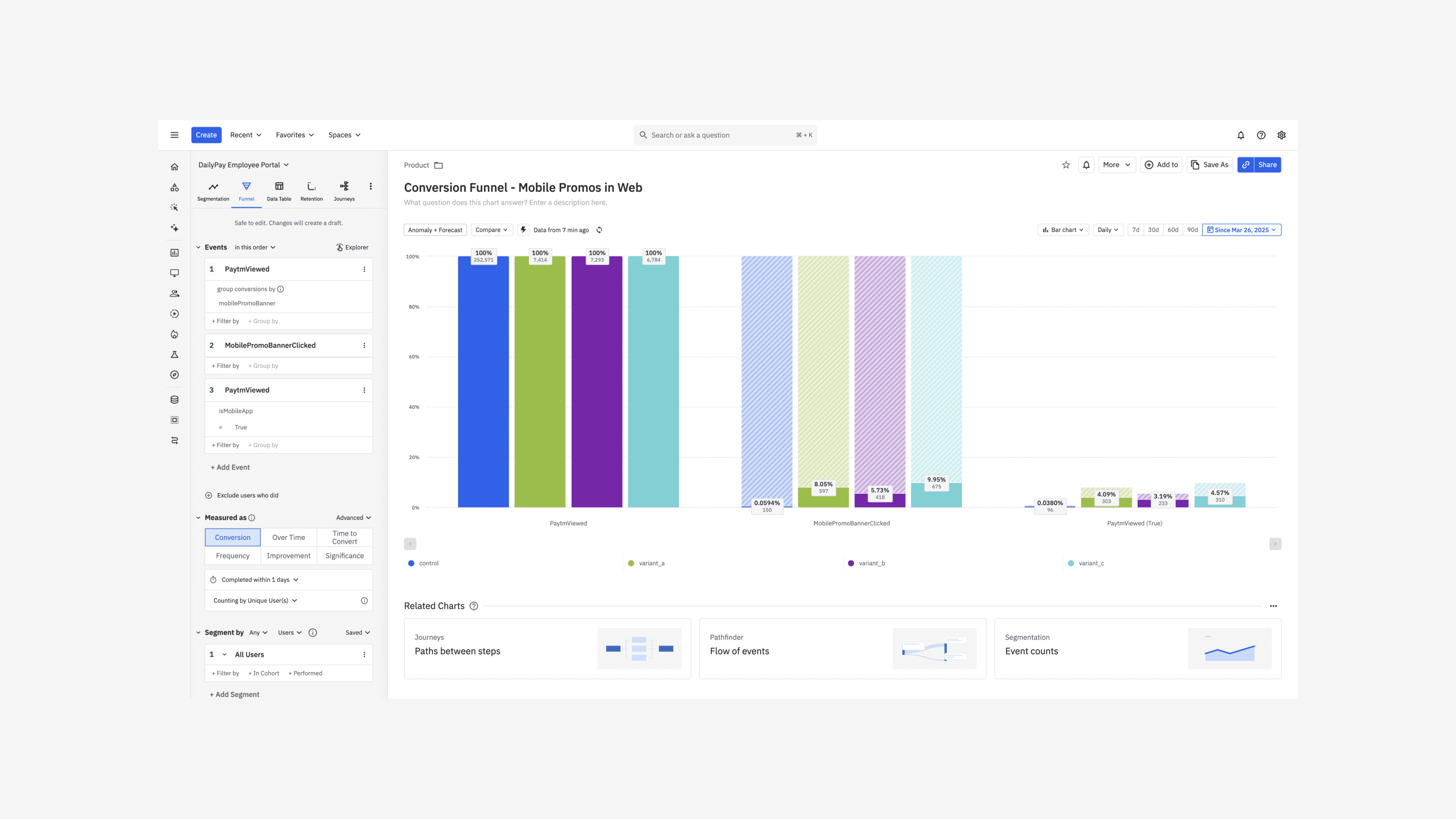 I tested three variants—Smart App Banner (A), Prominent Promo Card (B), and Static Bottom Banner (C)—against a holdout group (D) to quantify true lift. Each variant explored a different balance of visibility, intrusiveness, and UI real estate. Using Amplitude, I measured banner views, click-through rates, and downstream conversion into the native app.