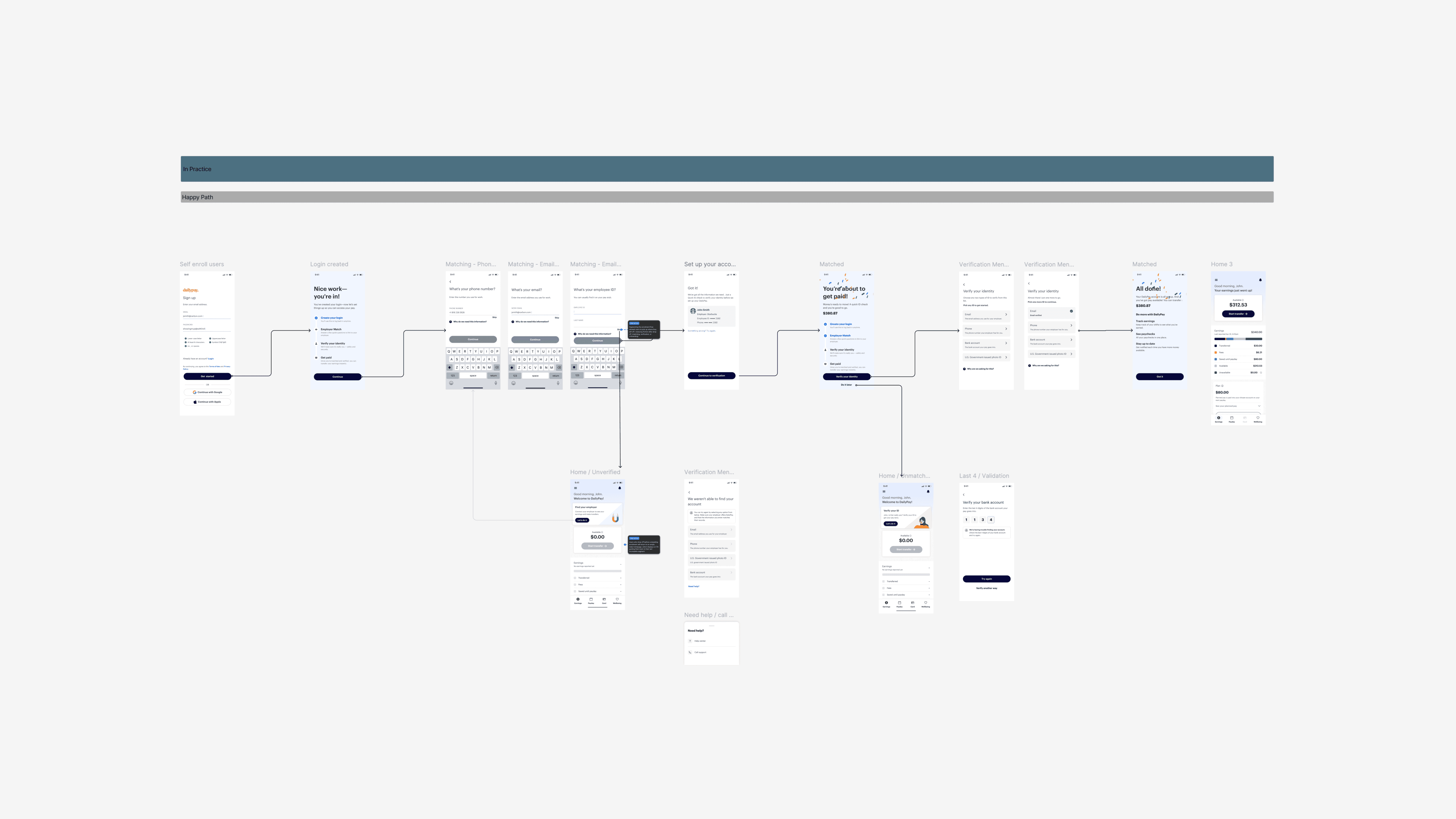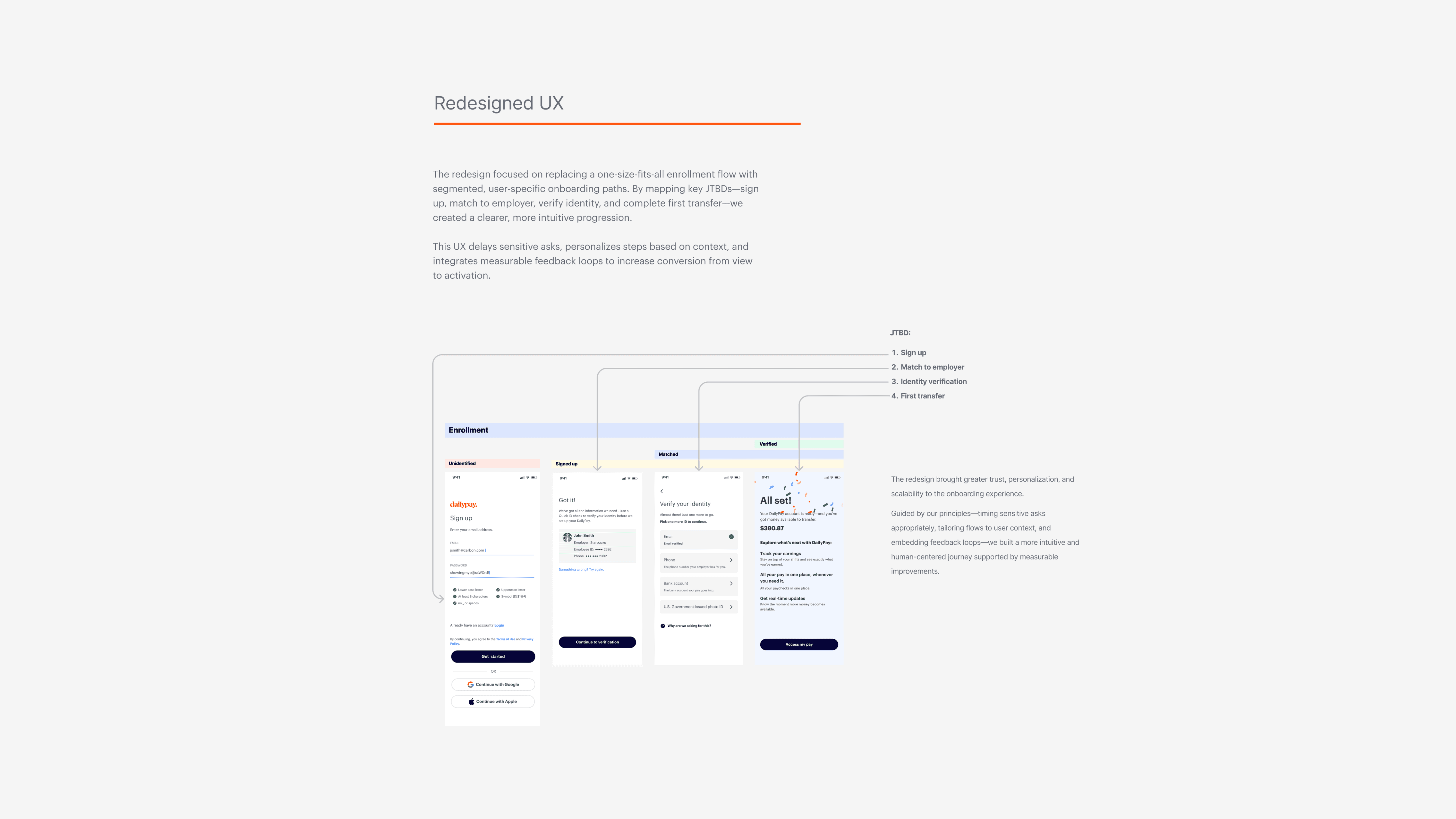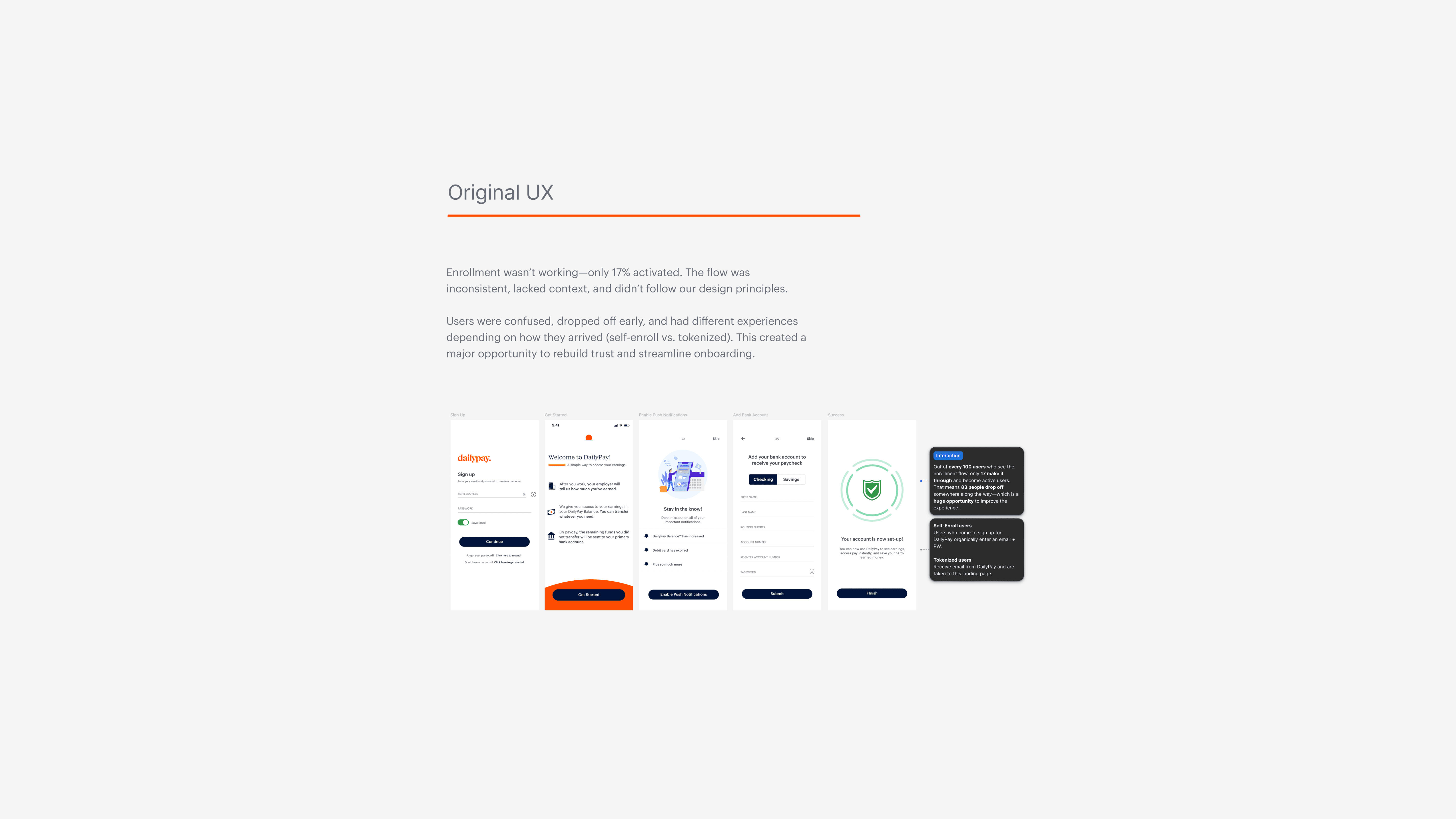 DailyPay’s enrollment experience had long struggled with inconsistency, high drop-off, and unclear guidance—especially for self-enroll users. To improve activation and create a more intuitive path from sign-up to first transfer, I led a comprehensive redesign as part of SPACE, a cross-functional task force dedicated to rethinking onboarding end-to-end.