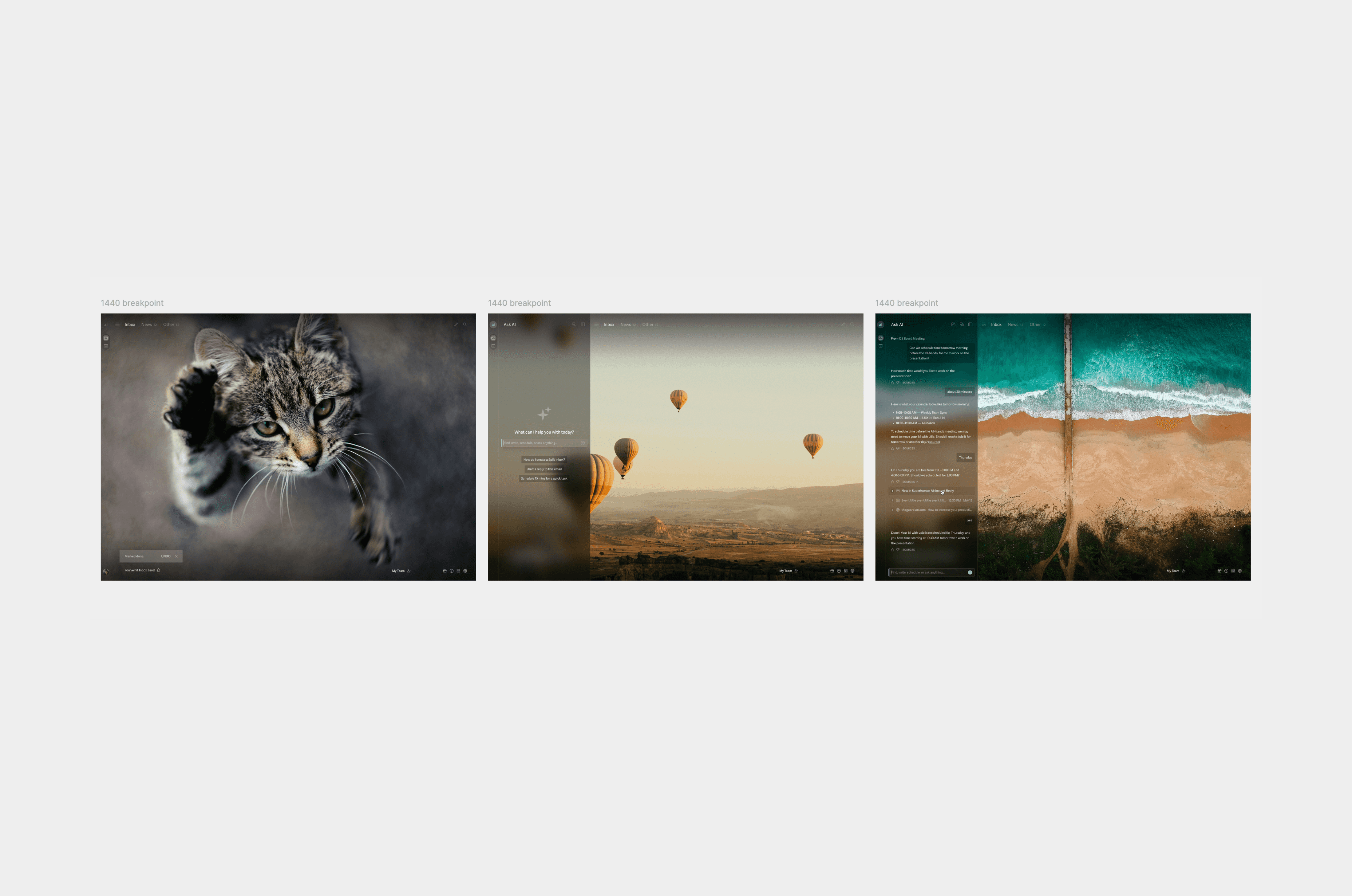 I led a design exploration focused on crafting a moment of delight when users reach Inbox Zero. The project combined cinematic imagery and subtle motion to evoke calm, reward, and satisfaction. The glass-like UI treatment was designed to complement the still visuals, balancing taste with a minimal, delightful aesthetic.